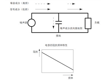低通濾波器如果要利用該特性,就需要將電容插入噪聲通道與地線之間。如此一來(lái),低頻信號(hào)能夠照常通過,高頻噪聲成分因接地側(cè)的阻抗較低,將流向接地側(cè),從而達(dá)到降噪效果。