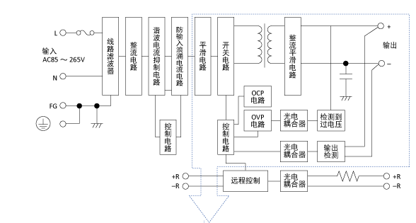 另一種控制恒流的方法是將外部電路連接到電源上,而不是像前面解釋的那樣通過(guò)過(guò)流保護(hù)轉(zhuǎn)移電流。以TDK的HWS1000為例來(lái)解釋這個(gè)過(guò)程:并聯(lián)電阻應(yīng)用在電源的負(fù)載線(xiàn)上,輸出電流的電壓轉(zhuǎn)換是通過(guò)并聯(lián)電阻實(shí)現(xiàn)的,并進(jìn)行輸出電流檢測(cè)。設(shè)計(jì)了恒流下垂點(diǎn)的調(diào)節(jié)電路,并建立了過(guò)流的標(biāo)準(zhǔn)電壓。在運(yùn)算放大器中比較(2)和(3)的電壓,在光耦合器中控制電源的輸出電壓。