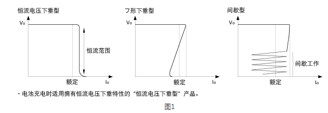 圖1中有三個(gè)主電源的過(guò)流保護(hù)特性。其中,適合電池充電的方式是擁有恒流電壓下垂特性的電源。通過(guò)運(yùn)用其恒流范圍,可以對(duì)電池進(jìn)行恒流充電。另外兩個(gè)特性不適合對(duì)電池充電,所以在選擇電源時(shí)要注意。